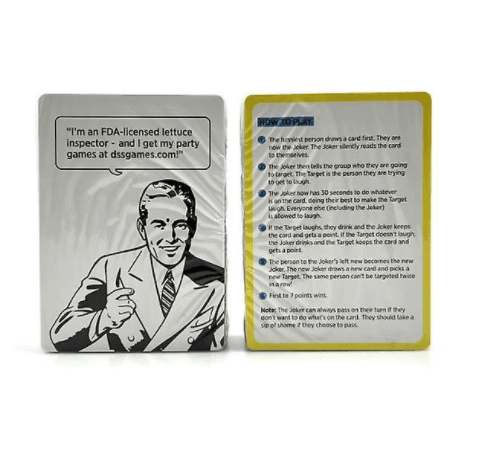 About this item. Size: 12*9*3cm. Package Included: 1*You Laugh You Drink Party Game. 150 cards with hilarious prompts that will make you laugh then make you tipsy. On your turn, do what the card says and dont hold back. For everyone else, can you keep a straight face if someone yells at your crotch or does a PSA on why sex is bad? Keep a straight face or bottoms up. For 3+ players ages 21+.